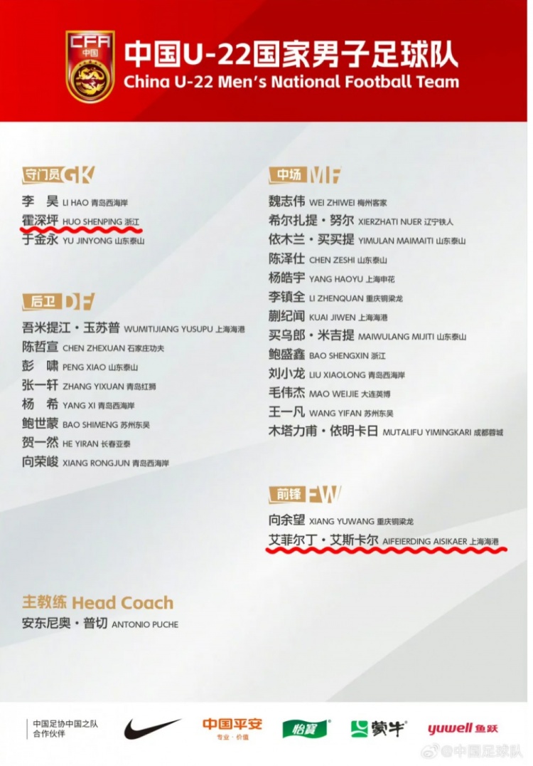 3月3日,中國足協(xié)公布U22國足2025年第一期集訓(xùn)名單,恒大足校培養(yǎng)球員霍深坪、艾菲爾丁入選。為備戰(zhàn)2026年U23亞洲杯及名古屋亞運(yùn)會(huì),隊(duì)伍定于2025年3月5日至26日赴江蘇省蘇州市、鹽城市組織集訓(xùn)并參加國際足球邀請(qǐng)賽。