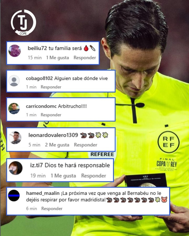 穆努埃拉因上周六在埃爾薩達爾球場頗具爭議的判罰,已成為皇馬球迷的眾矢之敵。其最新帖文下涌現(xiàn)近10萬條評論,充斥著針對其本人及家屬的各類辱罵與威脅。